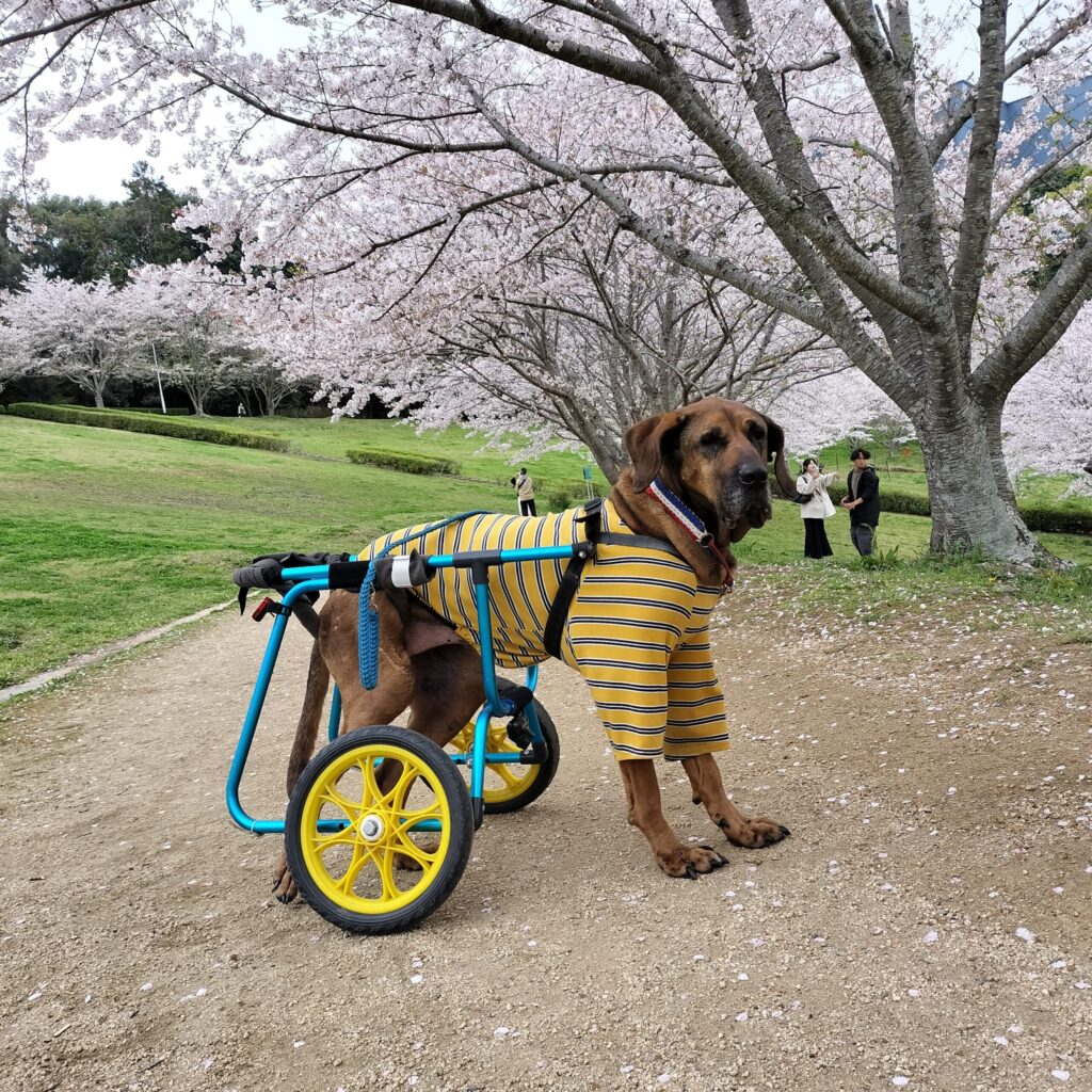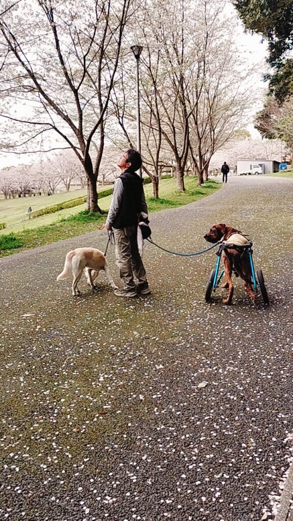 [車椅子の愛犬と見る桜、今年も変わらない景色]
